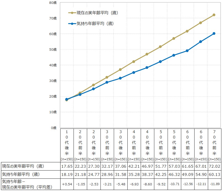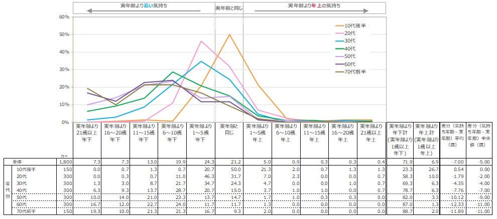20代以降の年代では、「気持ち年齢」と実年齢の平均差が少しずつ広がり、『実際の年齢より若い気持ち』の人が多い