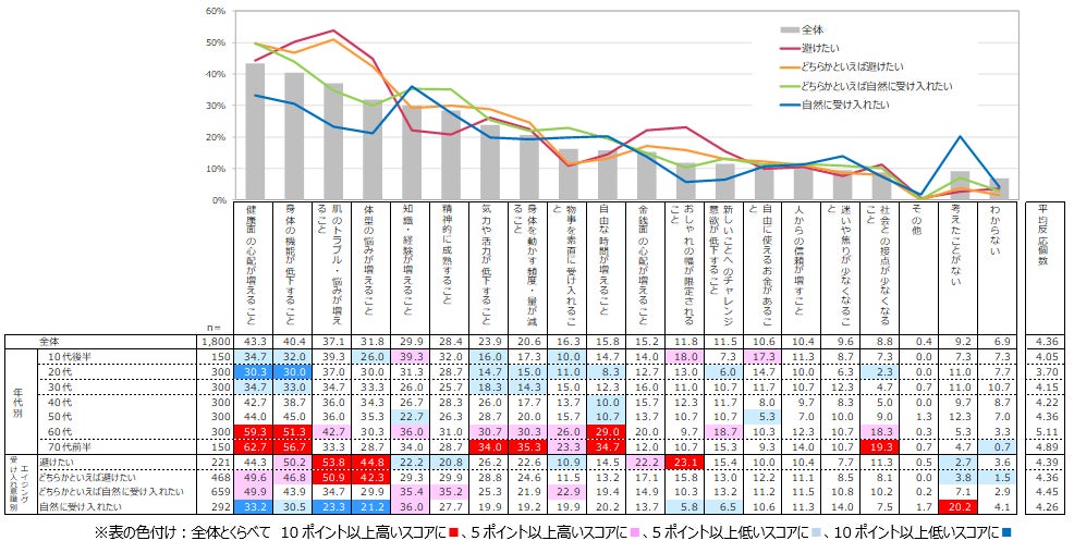 ➤ エイジングを避けたい人は、「肌のトラブル・悩みが増えること」「体型の悩みが増えること」「おしゃれの幅が限定される」が全体より10ポイント以上高い。