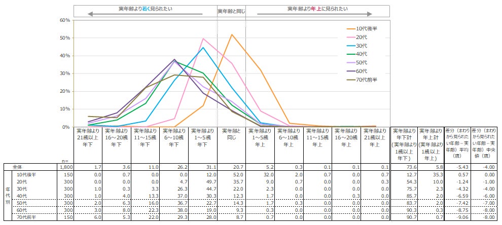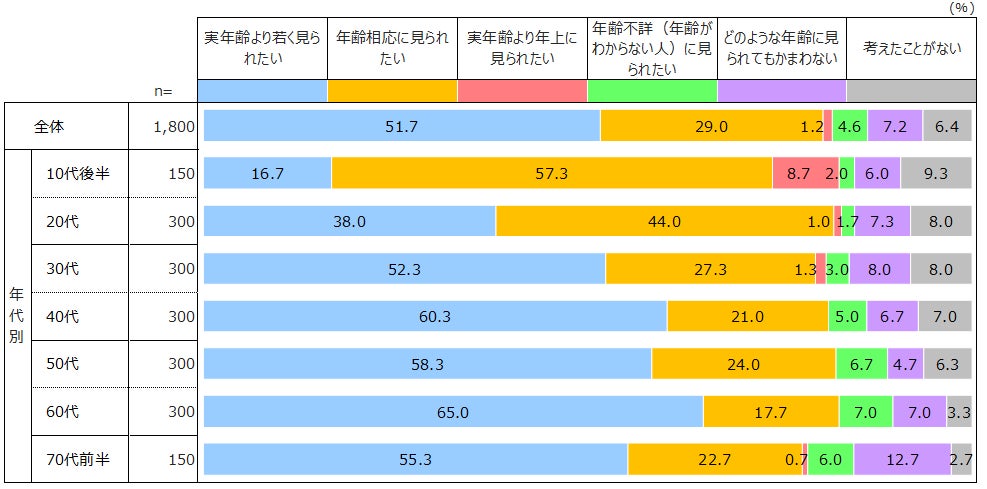 10代後半~20代では「年齢相応に見られたい」、30代~70代前半では「実年齢より若く見られたい」が多い