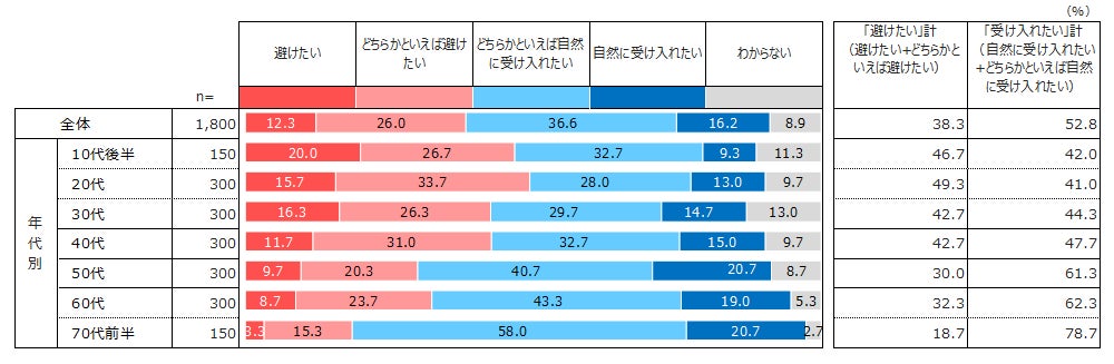 ・10代後半~40代の41.0~47.7%、50~60代の61.3%~62.3%、70代前半の78.7%は「受け入れたい」と回答。