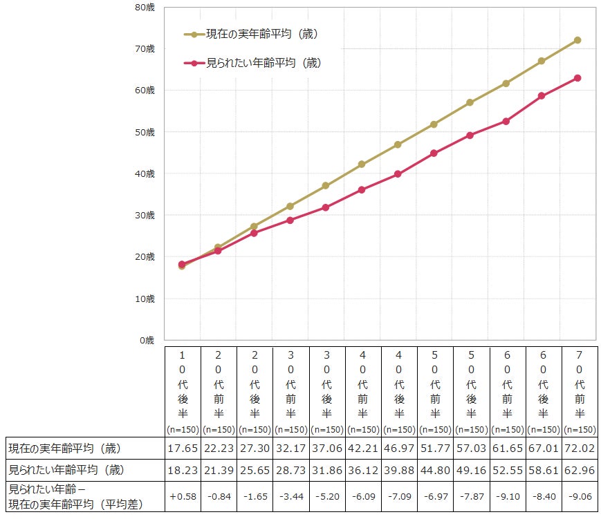 20代以降の年代では、「見られたい年齢」と実年齢の平均差が少しずつ広がる