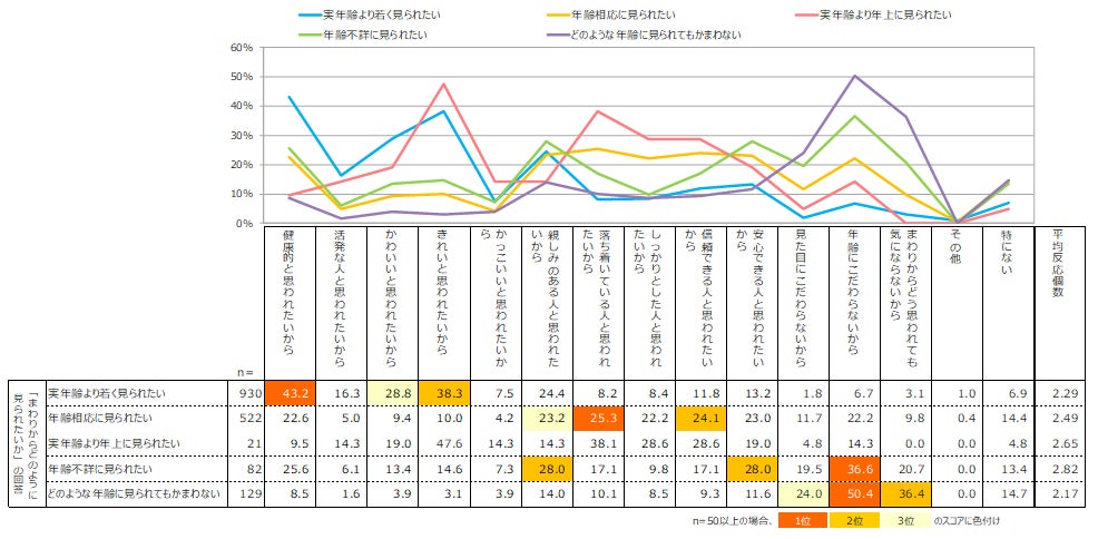 ➤ 「実年齢より若く見られたい」理由トップ3:「健康的」「きれい」「かわいい」と思われたいから。