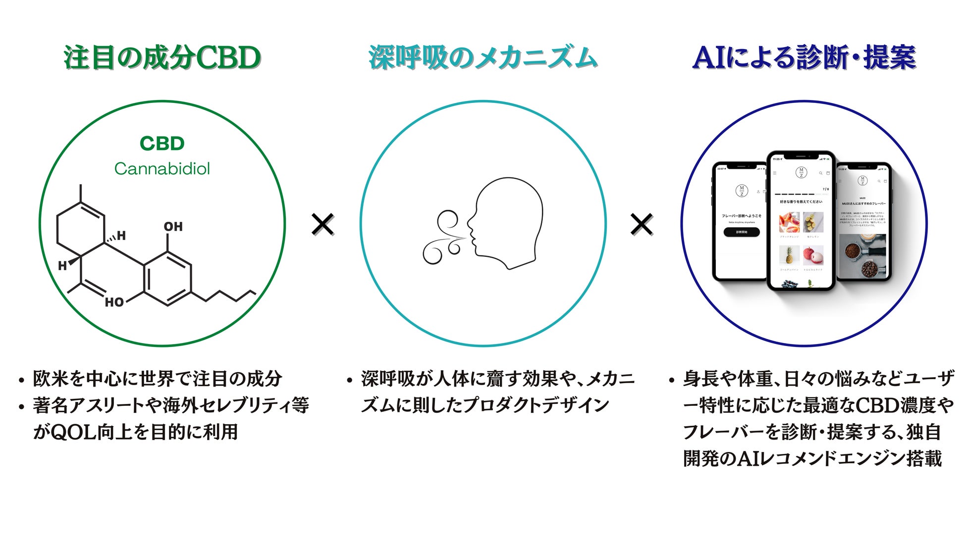IBM出身のAIスペシャリストと医師が共同開発した、既存のストレスケア体験をアップデートするために、世界中で注目を集める成分CBDと、AIを活用した世界初のパーソナライズ深呼吸デバイス。