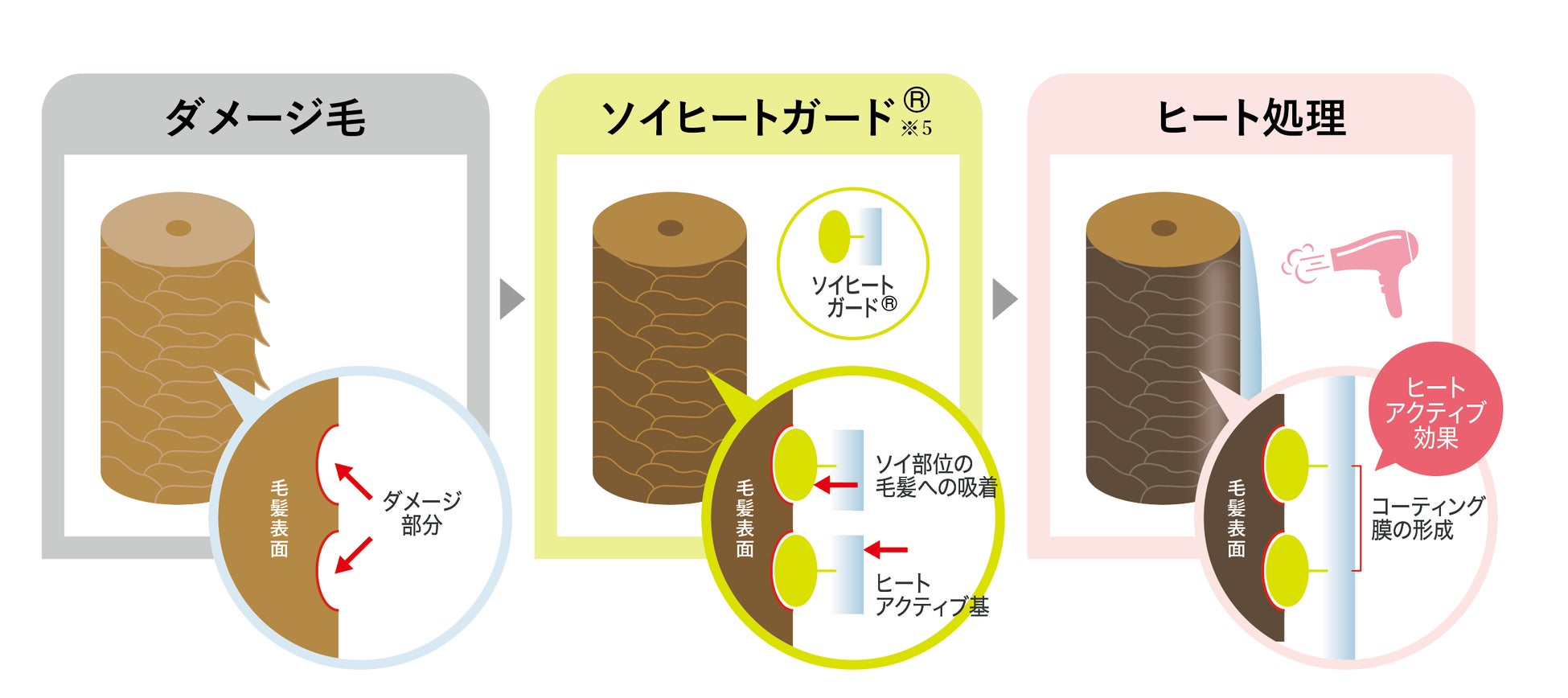 植物由来の毛髪補修成分ソイPPT※3がキューティクルのダメージ部分に密着&補修。さらにドライヤーの熱を利用したヒートアクティブ効果で、キューティクル層を集中補修します。さらに毛髪補修成分VEGANPLEX※4 配合で、毛髪内部のダメージ補修&強化。