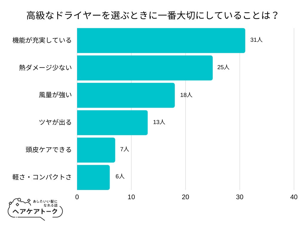 「高級なドライヤーを選ぶときに一番大切にしていることは?」とアンケート調査した結果、1位は『機能が充実している』でした。