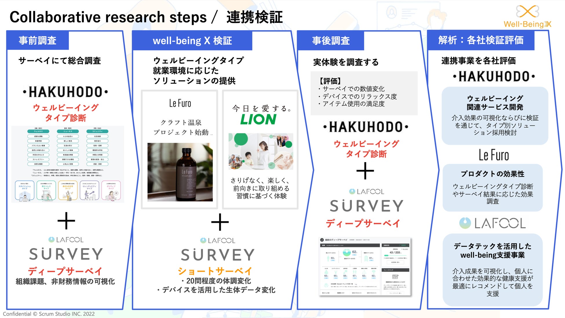 在宅勤務時のリラックス効果や集中を高めるための商品やサービスを利用することで、実際にメンタルヘルス・ウェルビーイングの改善に繋がっているかを、事前・事後の調査で定量的に観測し、効果判定を行います。
