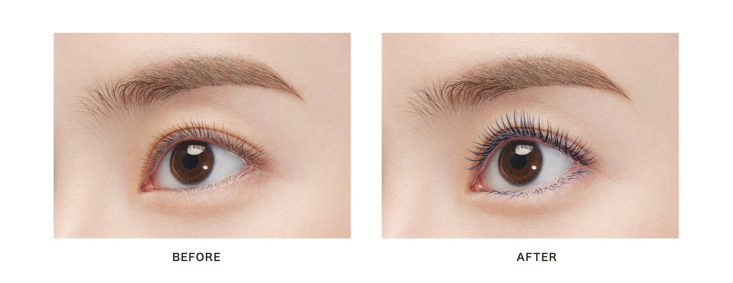 透ける青色の効果で、瞳に透明感をプラス。下地として使用し、上から黒のマスカラを塗布すると、横顔や目を伏せぎみにした時に微妙に下の青色が透けて、クールで奥行きのある表情に。