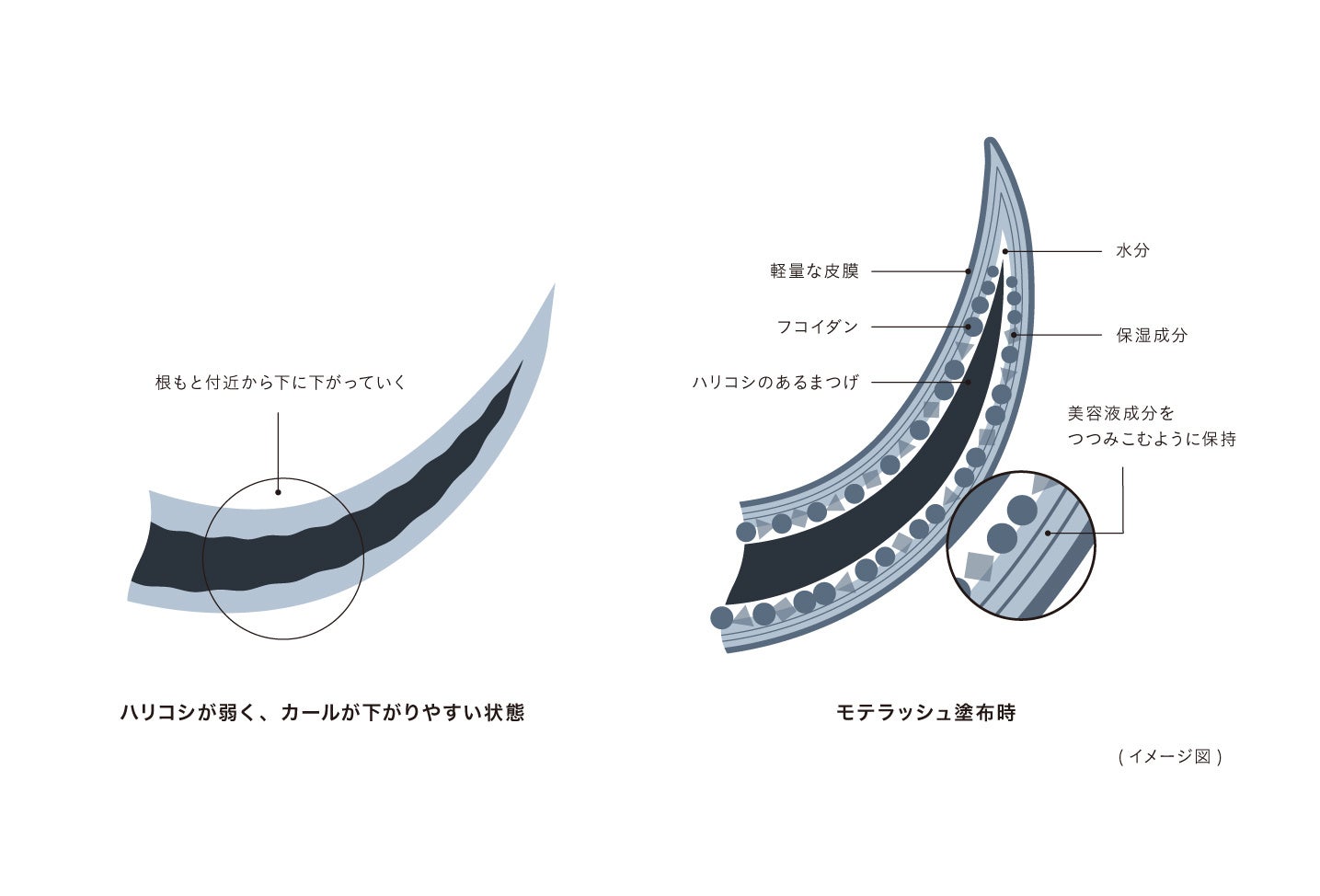 カールを実現する皮膜の基剤に、抱水性の高い油剤*2や植物性のスクワランを採用したことにより、まつげの乾燥を防ぎ、水分をキープ。さらには、海藻由来成分の高分子フコイダンが皮膜内にとどまることで、保湿効果を発揮します。通常のマスカラや、マスカラ下地に使用される複数の皮膜形成ポリマー類、および高融点ワックスの種類や配合比率を入念に調整*3。ケア効果に優れた、まるで「まつげのマスク」のような非常に軽量な皮膜*4が、しっかりとまつげを包んでカールをロック。まつげに負担をかけることなく、うるおいとしなやかさを保ちながらまつげを上向きにホールドします。