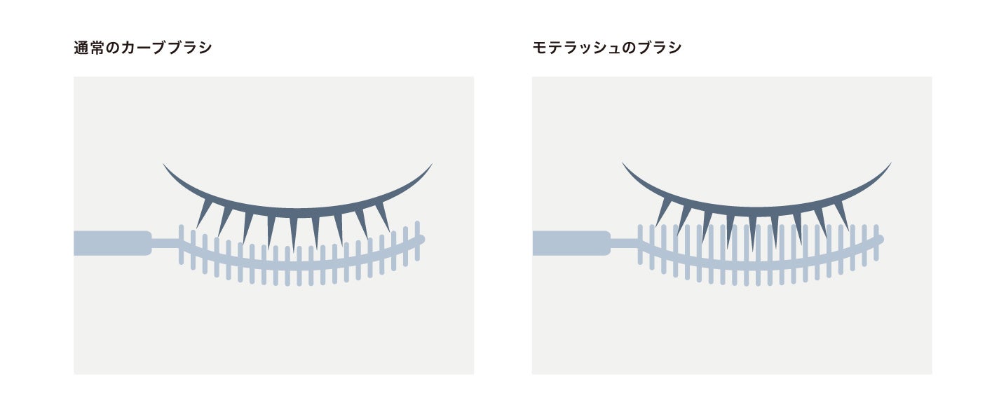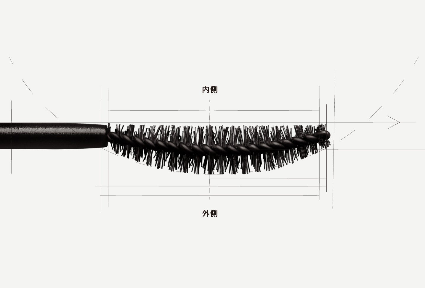 美容液をまつげの根もとから塗布膜を均一に、簡単に塗布できるブラシを開発。カーブの内側で直線状になるブラシファイバーが、自然にまつげの根もとに届き、均一な塗布膜と美しいセパレートを叶えます。毛の一本一本については、まつげの根もとにはしっかりと、そして毛先に向かっては軽くつく塗布膜を、ストレスフリーに実現。