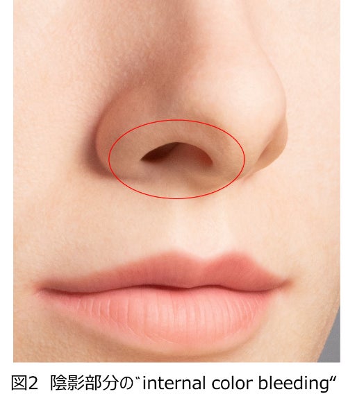 人の肌には半透明性があり、光が当たると、その光の一部は肌を透過し、肌内部で散乱・吸収され、その後肌の外に出ていきます。そこで今回、肌サンプルが人の肌と同様の半透明性を持っているのかを、花王が開発したエッジロス法*3を用いて分析しました。この結果、Kazu Hiro氏による肌サンプルは、長波長ほど半透明性が高いといった人の肌で見られる性質が認められました。さらに、人の肌特有の半透明性によって生じる、陰影部分が赤く色づいて見える“internal color bleeding”*4と類似した現象が見られることも確認できました(図2)。