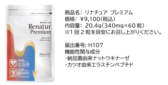 日本人の約3人に1人※が高血圧と言われており、そのままにしておくと動脈硬化や心臓病など様々な疾患の原因となる可能性があります。そこでダイアナでは、健康の為に体のめぐりを良くする生活習慣の提案をするため、ナットウキナーゼとエラスチンペプチドを組み合わせて使用した本商品を開発しました。