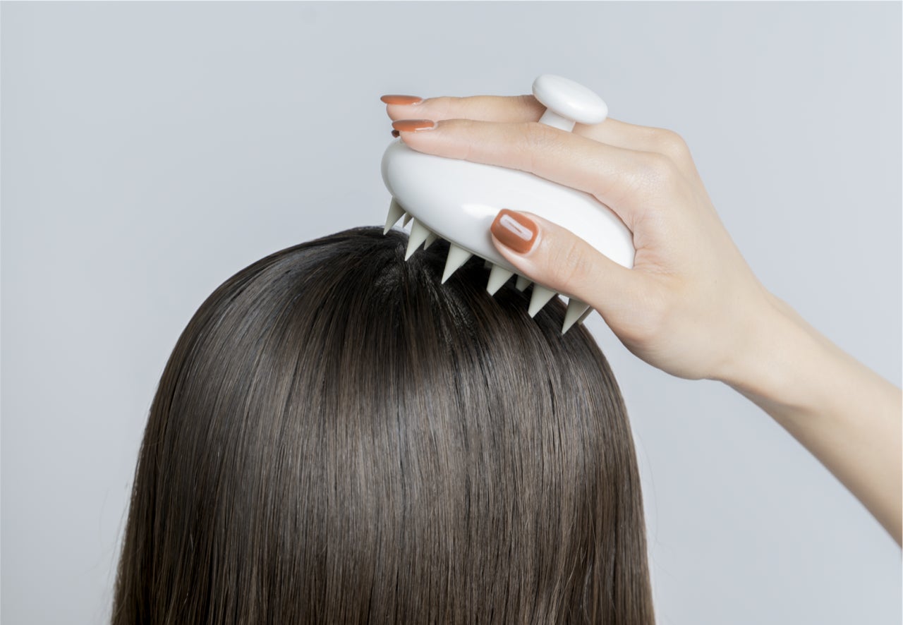 一般的にマッサージブラシに用いられる合成ゴムやプラスチック素材ではなく、独自開発したシリコン素材をブラシ部分に採用しました。哺乳瓶の先端にも使用されるシリコンを参考に開発した、頭皮に優しい素材となっています。適度な硬さのため頭皮を傷つけることなく、優しくマッサージしながら、頭皮の毛穴に詰まったスタイリング剤や皮脂を取り除きます。ブラシ部分には、頭皮の丸みに合わせてシリコンの突起を19個配置。さらに、持ち手部分とブラシ部分の間に空間を作るエアクッション設計により、持ち手に加えた力が突起ひとつひとつに効率的に伝わります。頭皮の汚れを取り除くだけでなく、同時に地肌の凝りをほぐすことができるため、血行促進とリフレッシュ効果が期待できます。