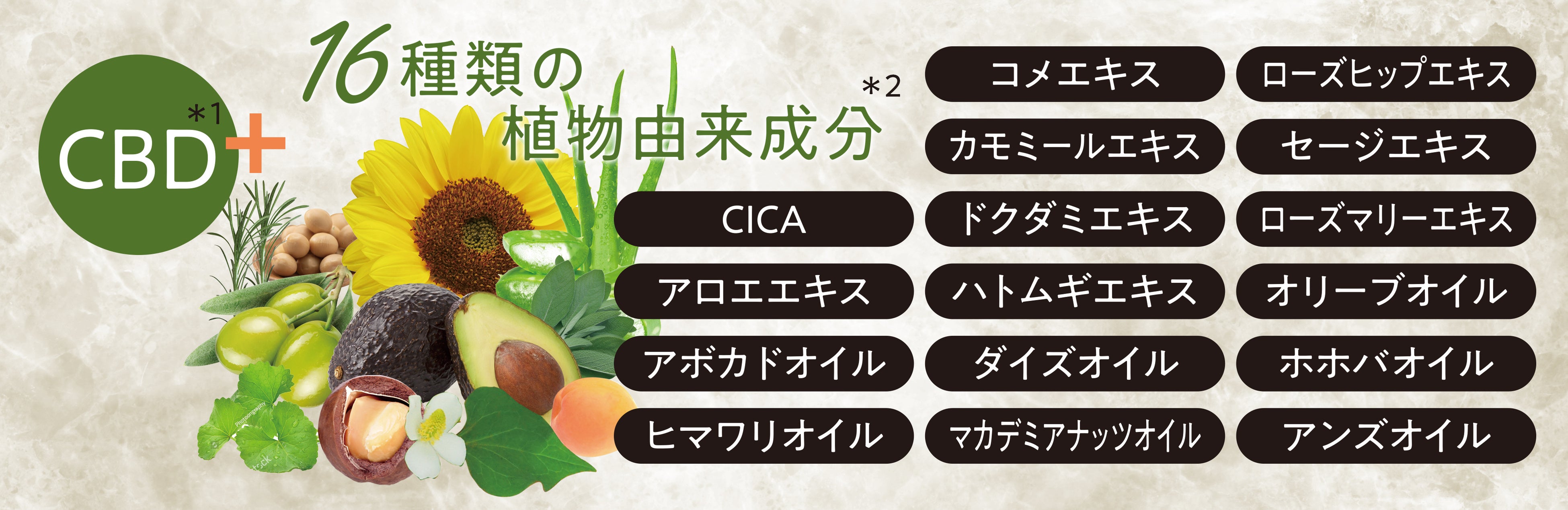 ●自然の恵みを感じる、CBD(*1)+16種類の植物由来成分(*2)配合