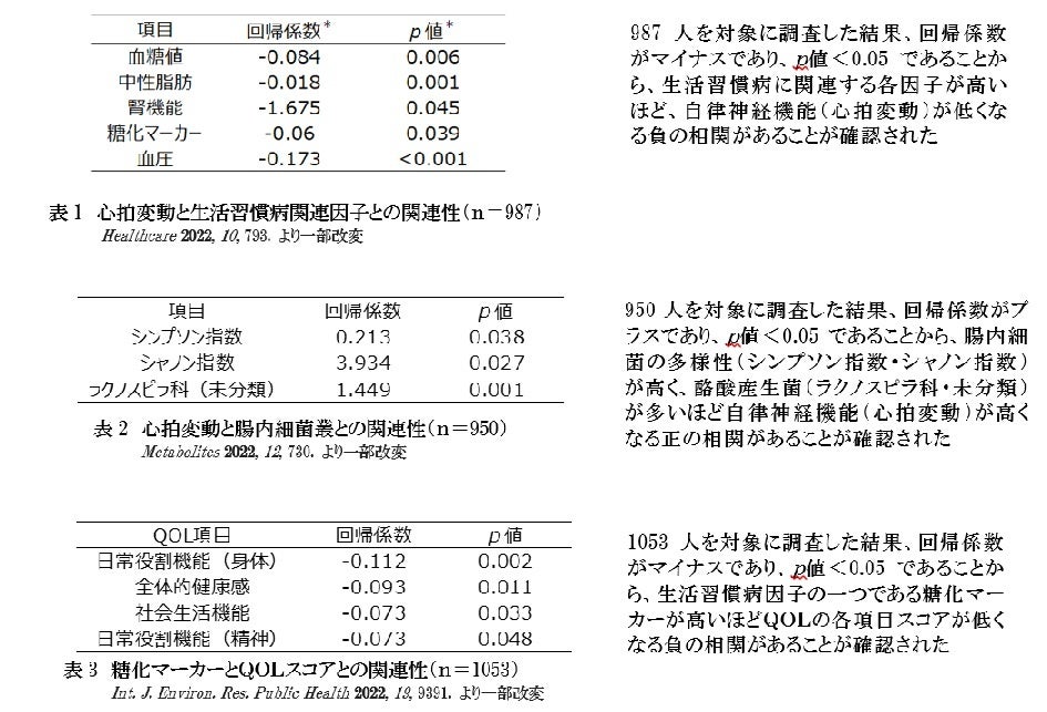 その結果、自律神経機能の一つである心拍変動※6は、加齢や肥満に伴って低下するとともに、生活習慣病関連因子や腸内細菌叢に関係していることを発見しました。さらに、生活習慣病関連因子の一つである糖化マーカー※7が、QOLに関連していることも発見しました。