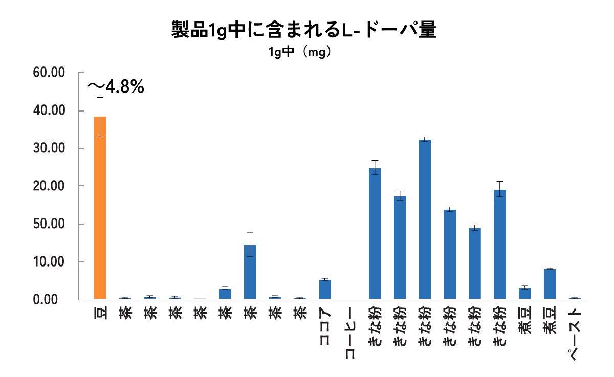 結果、本来ムクナ豆重量当たりには4~5%程度のL-ドーパが含まれますが、粉末状の製品には0.95~3.15%含まれたのに対し、お茶用とされる多くの製品でL-ドーパが微量にしか含まれておらず、ほとんどの製品で0.1%を下回ることが判明しました。