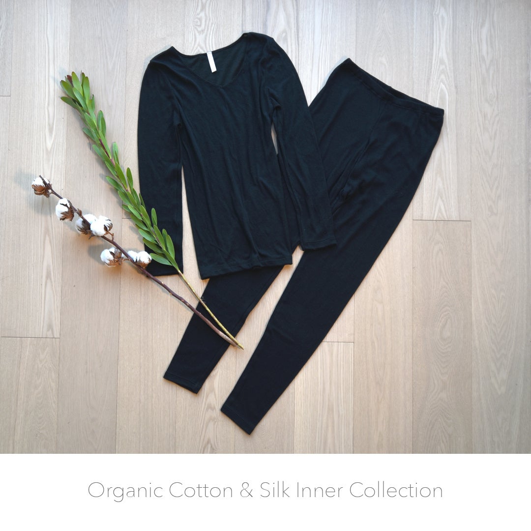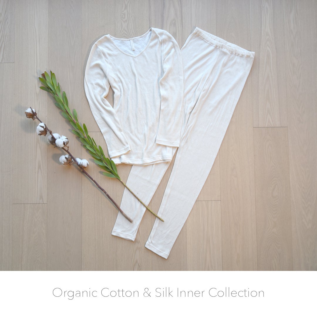 保温性、保湿性の高いオーガニックコットンと、吸湿性、放湿性に優れたシルクのダブルフェイス素材。着用した瞬間からやさしい肌触りとふんわりとした軽い着心地で、心身の緊張がほぐれていきます。静電気が起きにくく、肌への負担も軽減。薄手の生地ながらも、温かく体を包み込むので、敏感肌や乾燥肌の方、冷え性に悩む方にもおすすめです。カラーはナチュラル、ブラック、ピンク、グレーの4色展開です。
