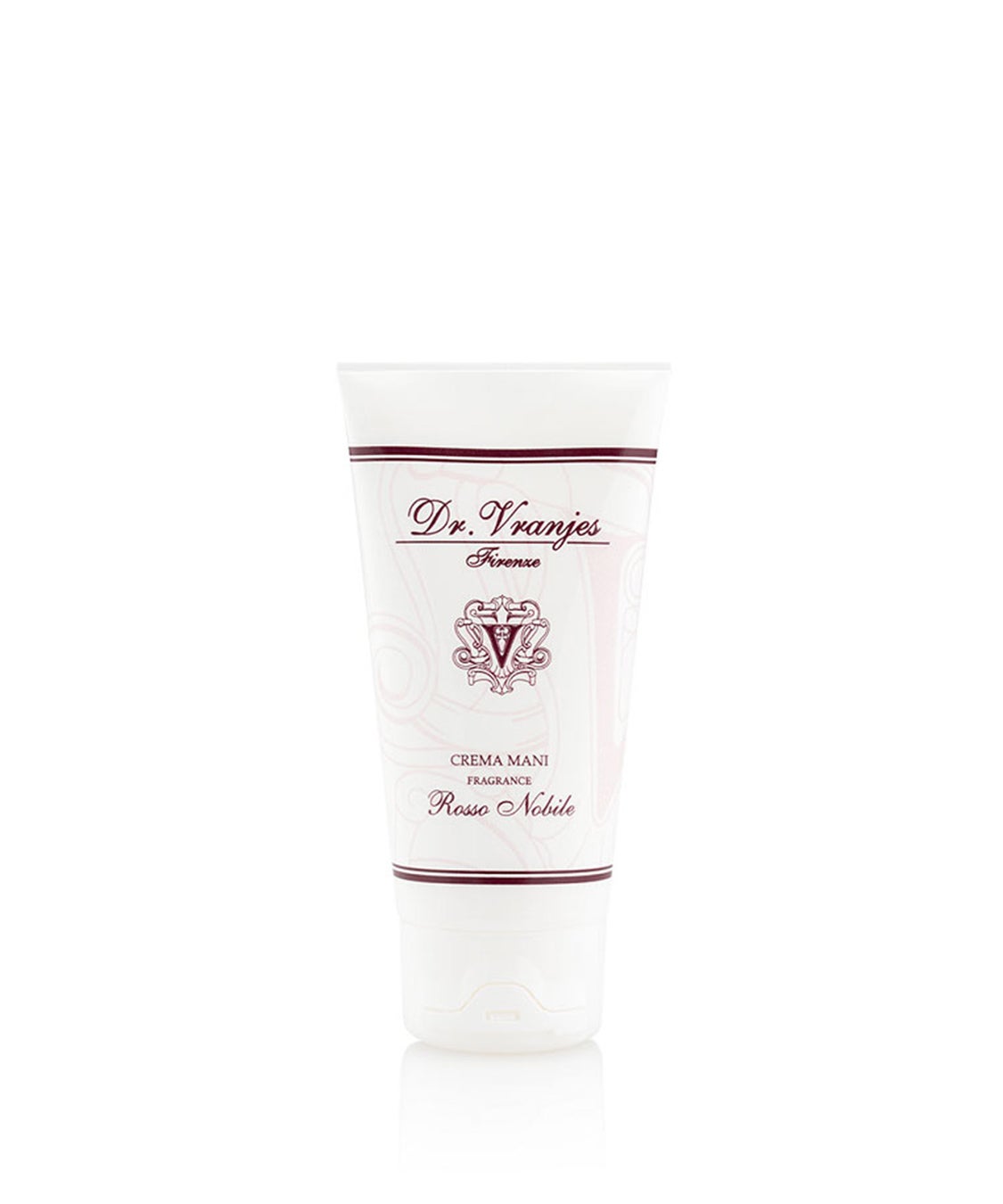 “Dr.Vranjesのアイコン的フレグランスROSSO NOBILE〈ロッソ ノービレ〉のハンドクリーム。肌にのせた途端、芳醇な赤ワインをモチーフにした数々の果実や花々、タンニンの渋みが織りなす豊かなアロマが広がります。肌にすっとなじむ軽やかなテクスチャーで、石油系油脂を含まず、天然由来のビタミンEやオリーブオイルなどの植物油が肌に潤いを与え、乾燥や刺激から守ります。
