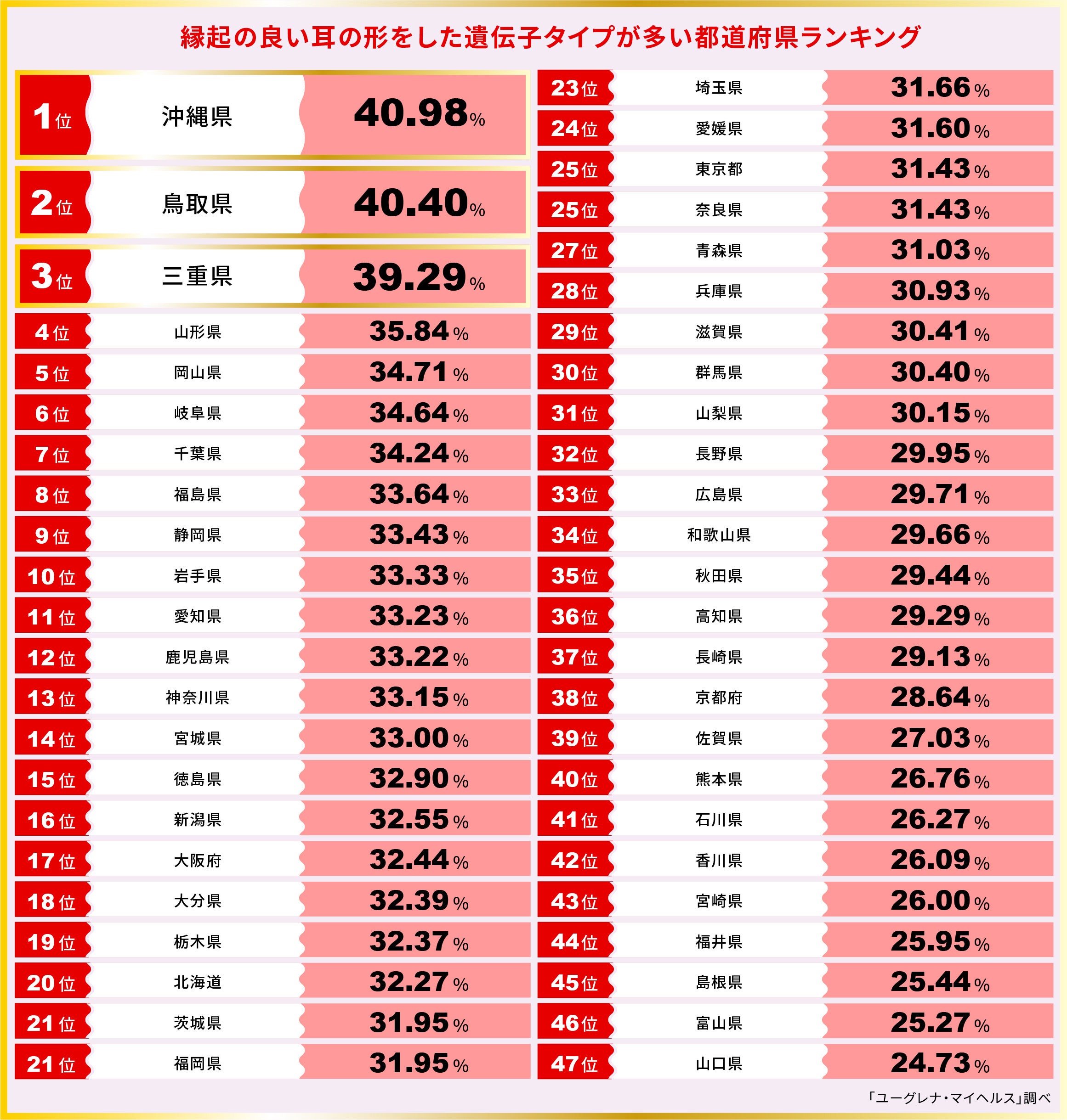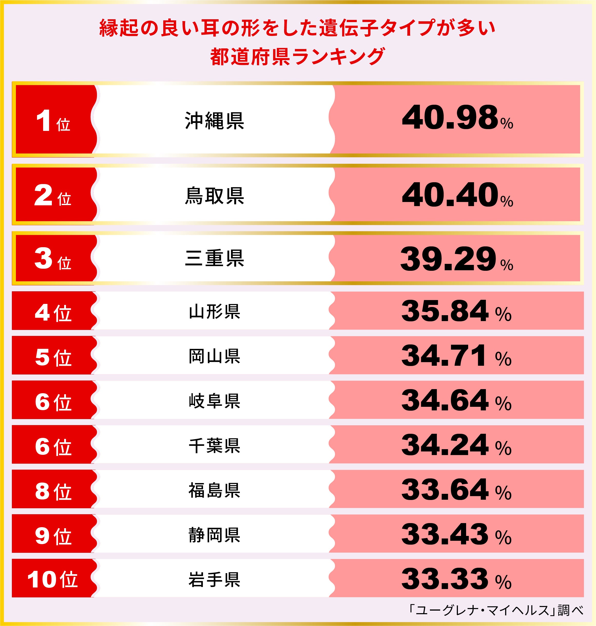 上記の解析結果より、縁起の良い耳の形をした遺伝子タイプの人の割合が相対的に高い都道府県は、1位 沖縄県、2位 鳥取県、3位 三重県、4位 山形県、5位 岡山県、6位 岐阜県、7位 千葉県、8位 福島県、9位 静岡県、10位 岩手県となり、割合でみると上位の沖縄県と鳥取県は4割超え、三重県は4割近くの方が理想の福耳の遺伝子タイプであることが分かりました。