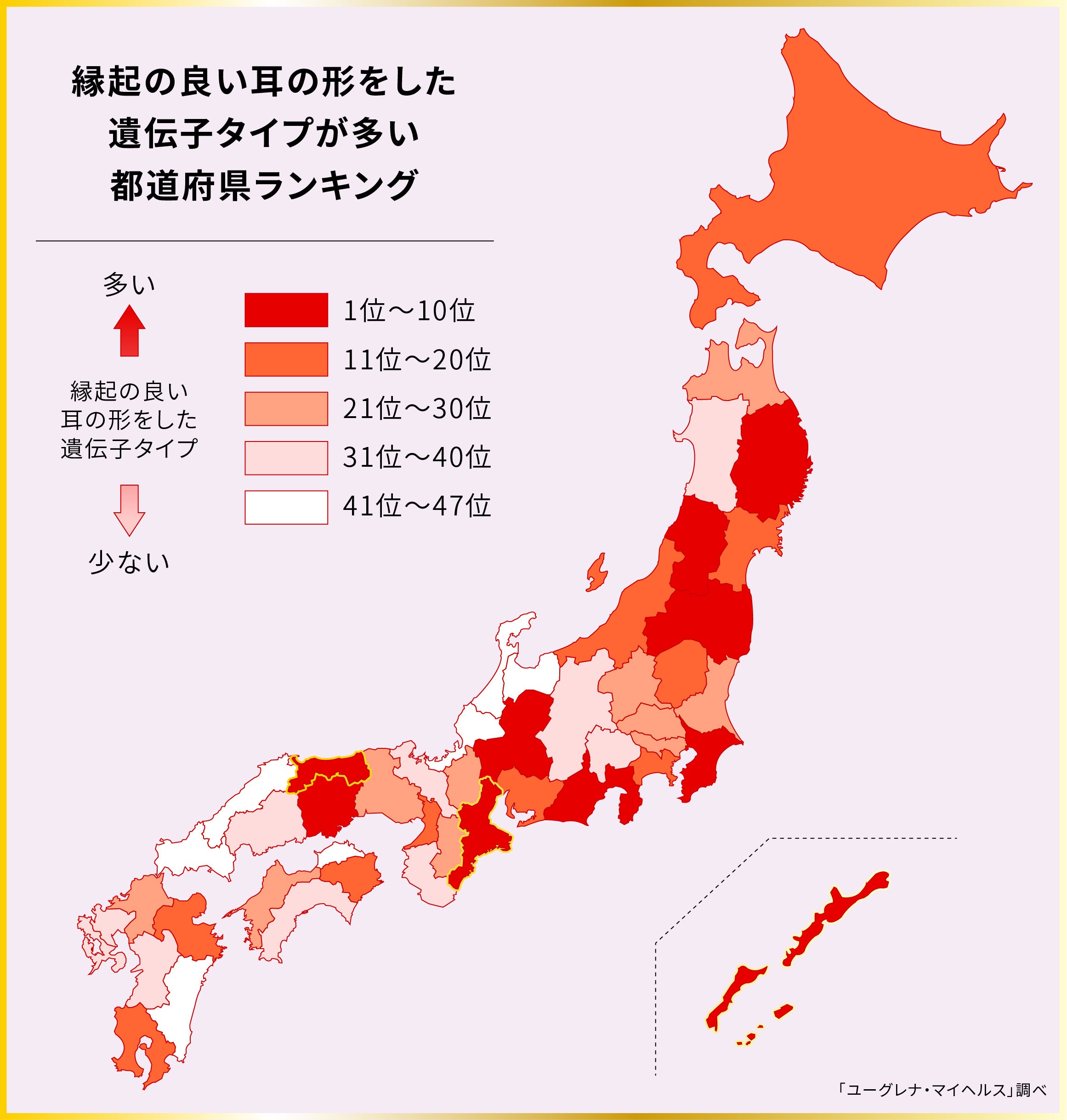 株式会社ユーグレナ(本社:東京都港区、代表取締役社長:出雲充)は、ユーグレナ・マイヘルスとジーンクエストの遺伝子解析サービスのゲノムデータをもとにした「縁起の良い耳の形をした遺伝子タイプが多い都道府県(出生地※)ランキング」を公開いたします。