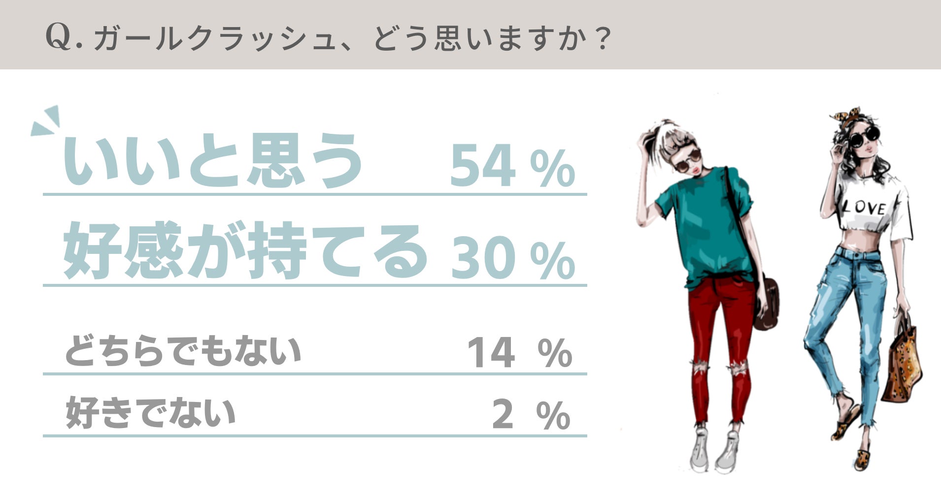 今回20~40代女性に「ガールクラッシュ、どう思いますか?」と尋ねたアンケートでも、半数以上の54%が「いいと思う」、30%が「好感が持てる」と回答しました。
