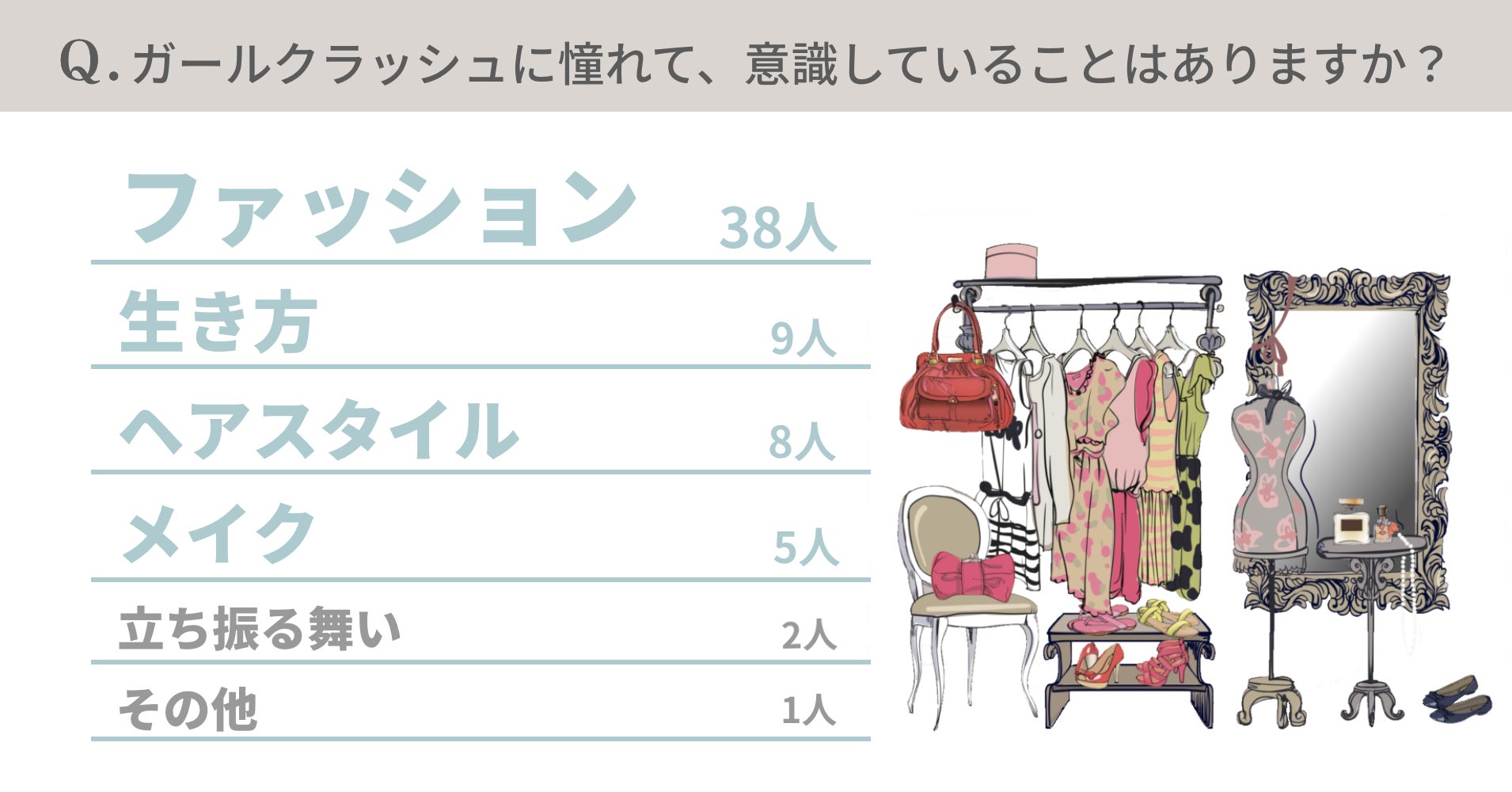 回答は「ファッション」が38人といちばん多く、「生き方」8人、「ヘアスタイル」8人、「メイク」5人、「立ち振る舞い」2人、「その他」1人、という結果となりました。