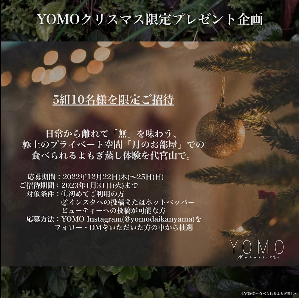 ◎クリスマス限定5組10名様を代官山よもぎ蒸しサロン「YOMO」ご招待企画
