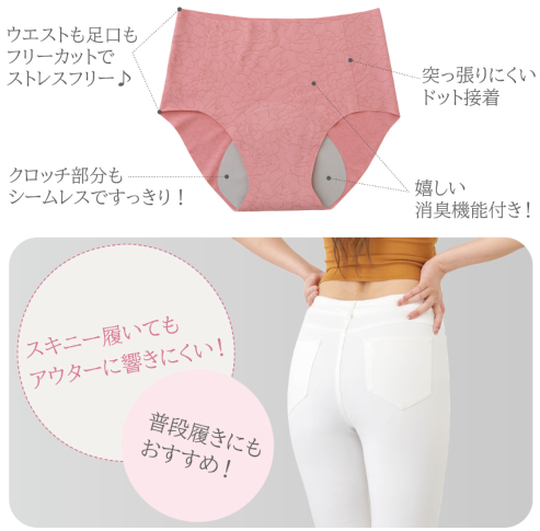 究極の無縫製® 吸水ショーツは今までになかった吸水サニタリーショーツです。 縫い目が一切ない仕様で、アウターに下着のラインがひびきにくくなっています。 ブルーデイでもアウターを気にせずどんなスタイルでもご着用いただけます。