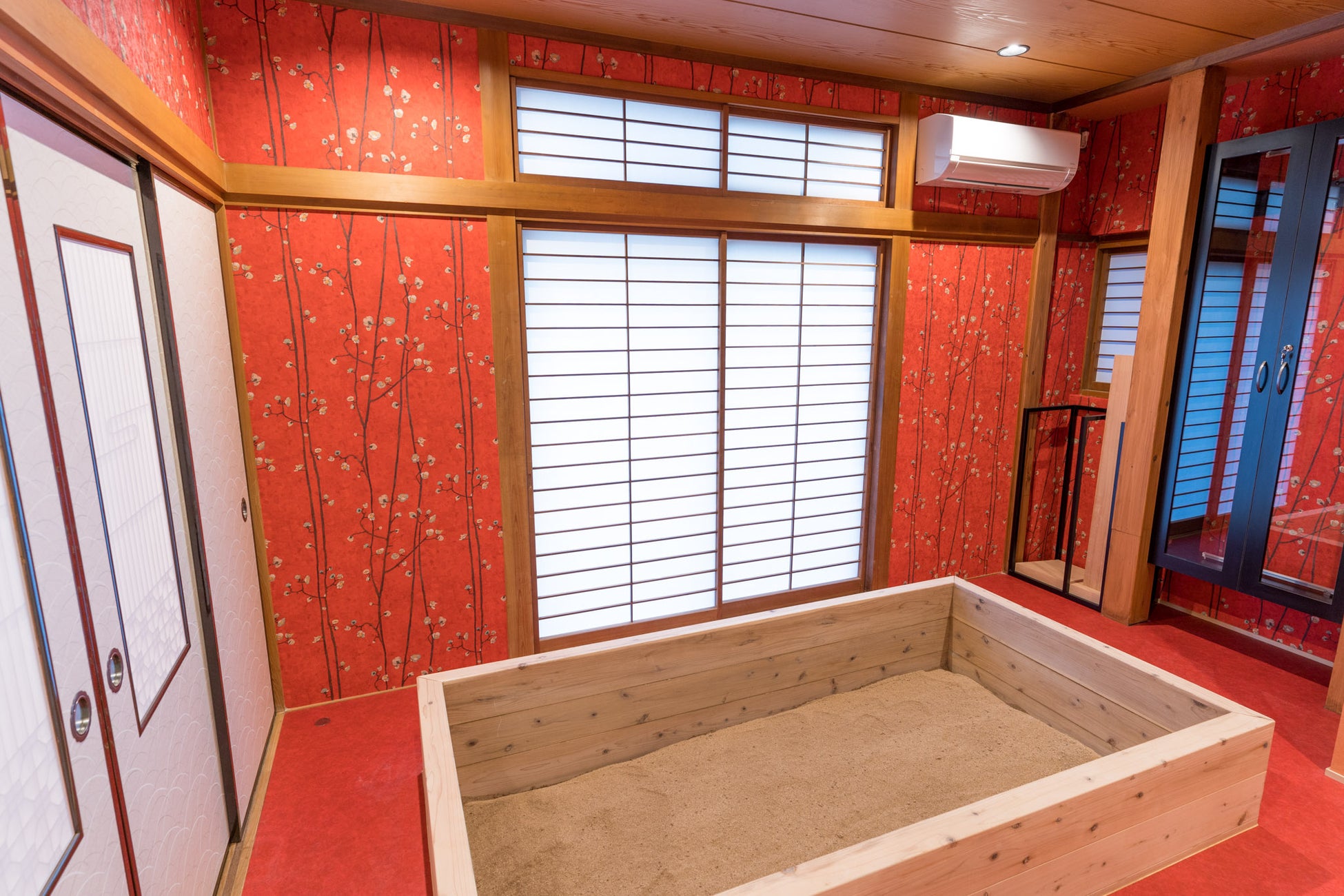 日本の伝統色・濃紅梅に彩られた個室浴室「レッドルーム」