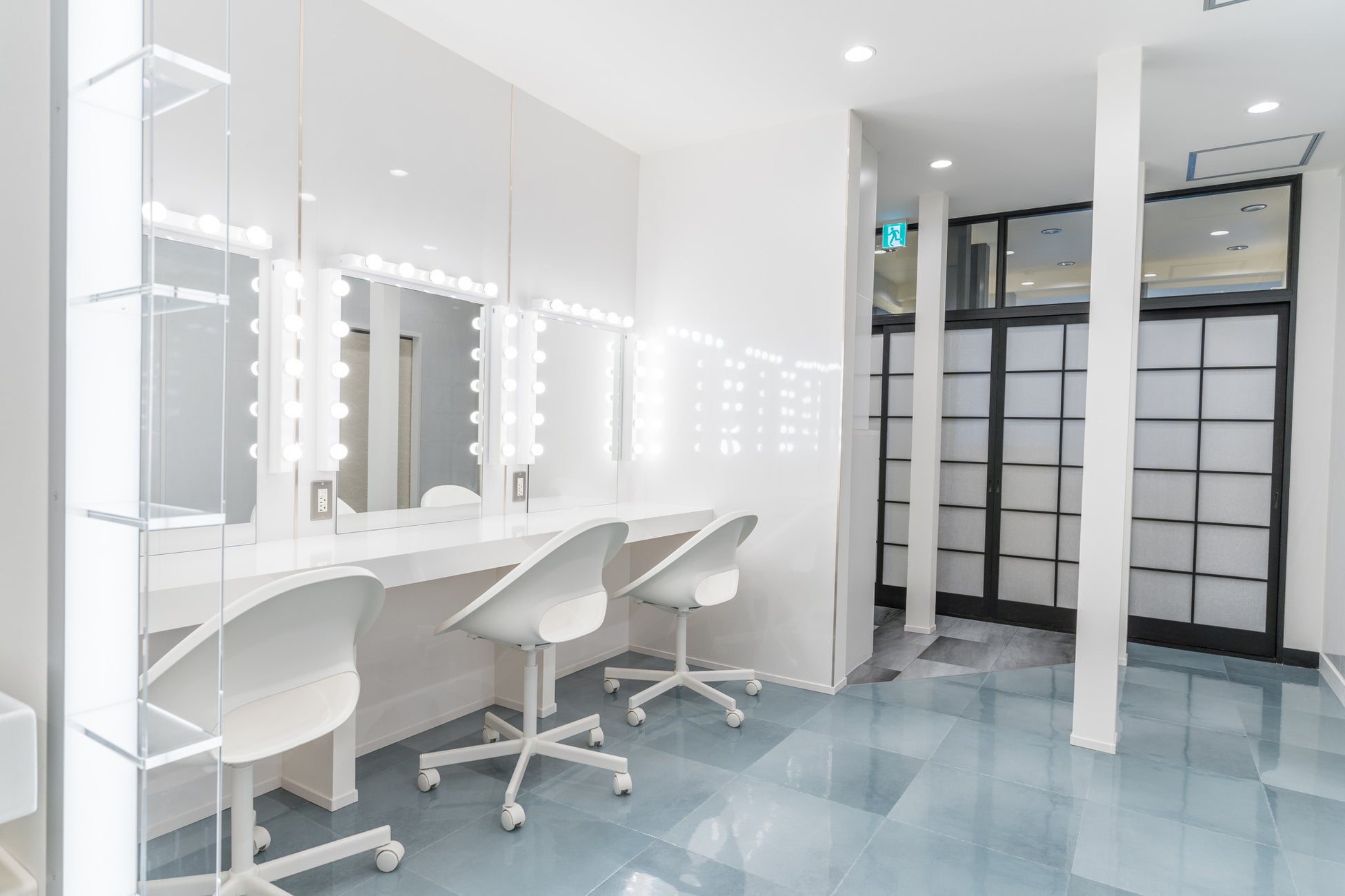 発酵コスメのスキンケア用品や米ぬかヘアオイルなどのアメニティが揃う、クリーンな「パウダールーム」