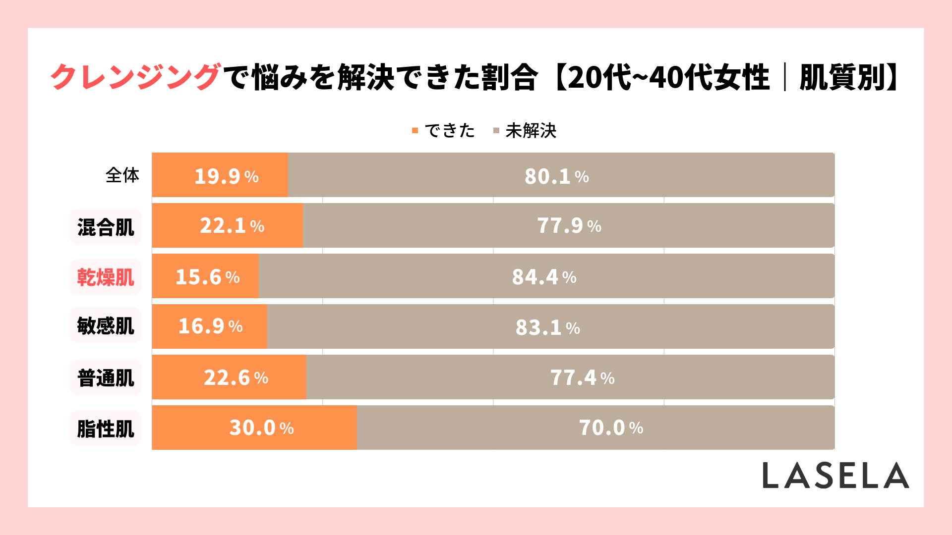 クレンジング購入者の悩みを解決できた割合を調べてみると、「解決できた」と回答した人は約2割でした。この結果を肌質別で比較してみると、乾燥肌は15.6%で最も低いことが分かりました。