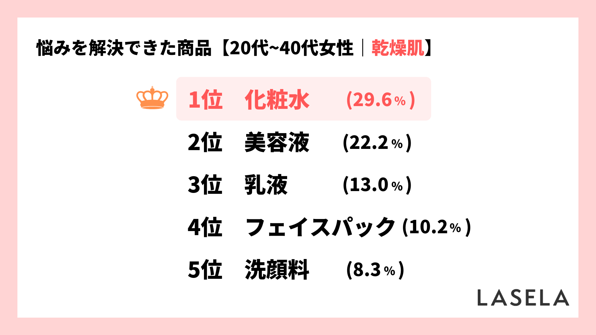 乾燥肌は、肌の水分を補うことが何よりも大切なため、保湿ケアができる化粧水や美容液などが選ばれているのではないかと考えられます。