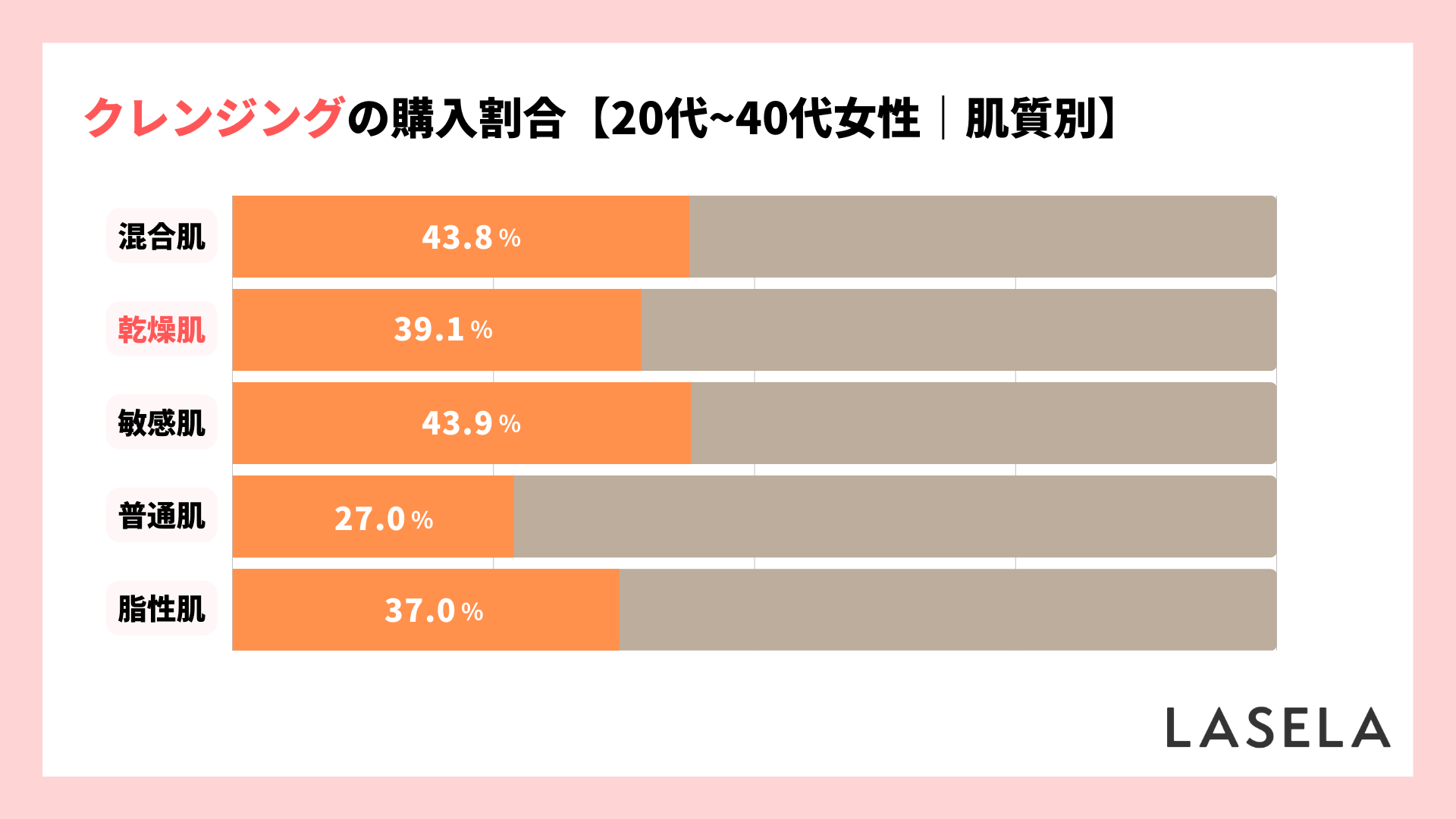 また、肌質別にクレンジングを購入した割合で比較すると、割合が高かったのは「敏感肌(43.9%)」と「混合肌(43.8%)」で、「乾燥肌」は全体で3番目となりました。