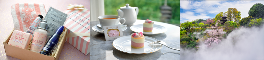 新しい春を迎える方へエールを贈る、ロクシタンの桜の香り「チェリーブロッサム」のボディケアアイテムなどが詰まったギフトセットや、お部屋でお召し上がりいただく、桜クリームの季節限定ケーキがついた、春におすすめのステイプランです。