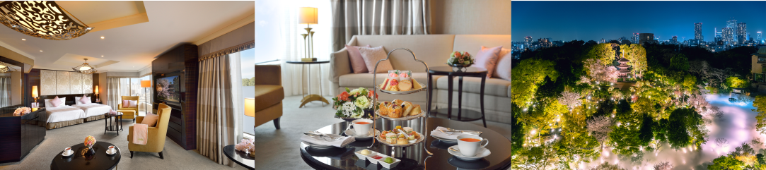 「ラグジュアリーアフタヌーンティー in 桜ビューバススイート」は、庭園を望むビューバススイートにお泊りいただき、バスタブという特等席からのお花見をお楽しみいただけます。また、お部屋では、通常バスアメニティではご提供していないロクシタンの桜の香りなどのアメニティをご用意。さらに、ご帰宅後も桜気分を楽しんでいただけるよう、ロクシタンの桜香る豪華なギフトコレクションもプレゼント。「チェリーブロッサム」のボディケアアイテムに加え、美白シリーズのスキンケアやヘアケア、ブランケットやトートバッグなど計20点も詰まった豪華なギフトセットです。 その他、普段ご予約が困難な「ル・ジャルダン」のアフタヌーンティーを、紅茶とスパークリングワインもセットにしてお部屋にお届け。見て、香って、味わう、五感で桜を堪能できるステイプランとなっております。