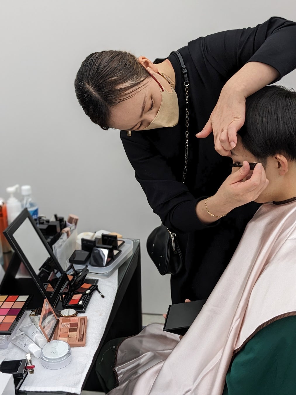 今回、更なる活動のひとつとして、固定観念に囚われない自分らしいメイクを楽しんでほしい、そして購入後うまく使えてない化粧品を活用するきっかけを作り、化粧品の廃棄量を減らしたいという想いに感銘を受け、ジェンダー問わず幅広い年齢層の方々に対して、自分のなりたいメイクを体現するメイクアップワークショップを渋渋生と行いました。当日は事前に申し込みをしてくださった10~40代男女13名が参加。会場特設のメイクアップ体験ブースにて、自分のしたいメイクがあるけれど挑戦できないという参加者に、ご自身がお持ちのメイク商品とKao Beauty Brandsのメイク商品を使用し、自分の希望に合ったメイクを楽しんでいただきました。その後、会場に設けられた撮影スペースにて、写真撮影を行いました。