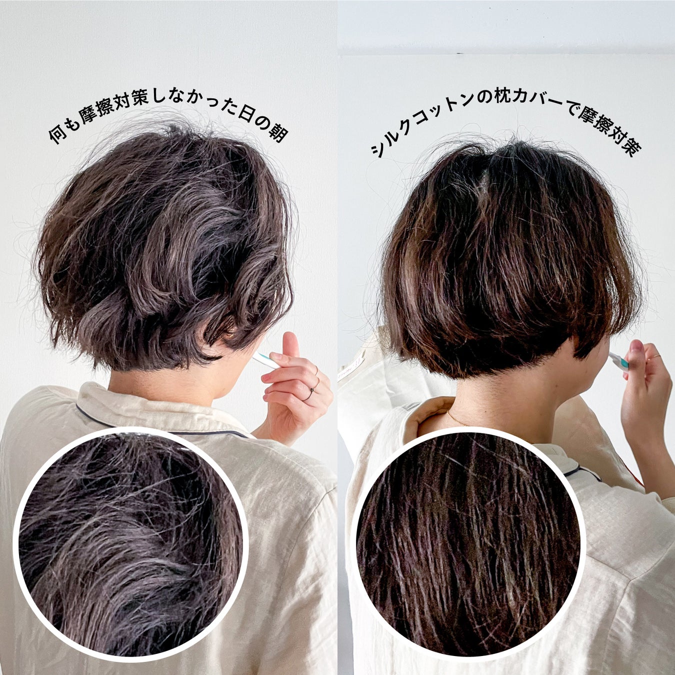 頭の重さと枕の反発によって寝ている間中ずっと髪に摩擦が加わり続けて、キューティクルが剥がれ水分が流出。シルクコットン生地の枕カバーは、パサつきや絡まり、寝ぐせの原因に着目した、髪の摩擦を軽減するためのアイテム。