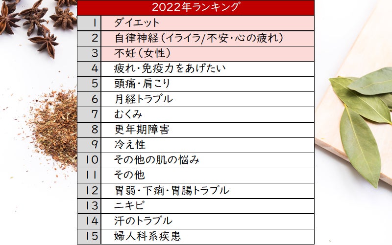 わたし漢方株式会社(本社:東京都渋谷区、代表取締役社長:丸山 優菜、以下わたし漢方)が運営する、薬剤師とLINE上で相談して自分にあった漢方薬を配送してくれるオンライン漢方相談サービス『わたし漢方』は、2022年に相談の多かったお悩みをランキング形式でまとめましたのでお知らせいたします。