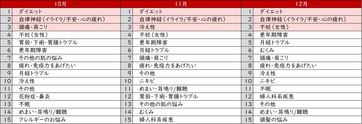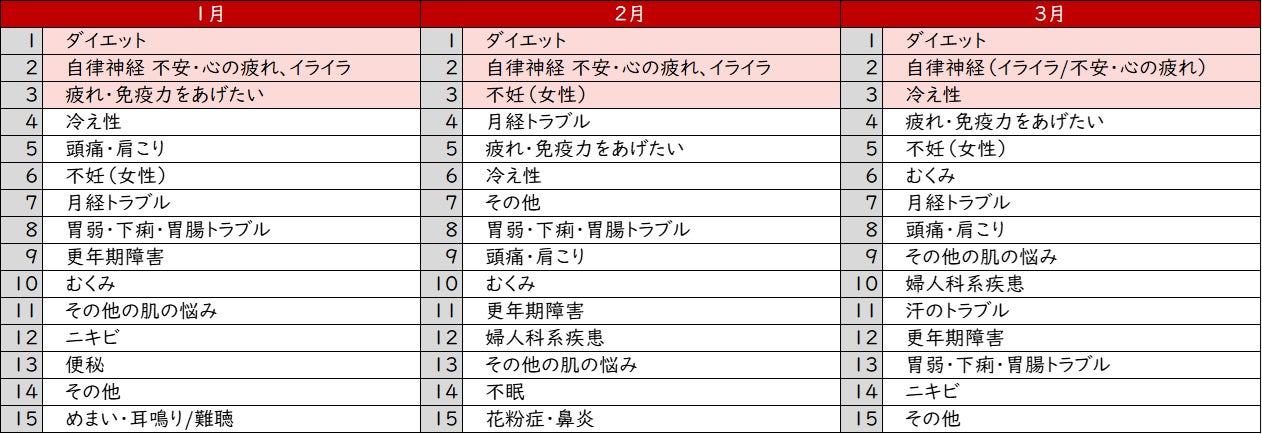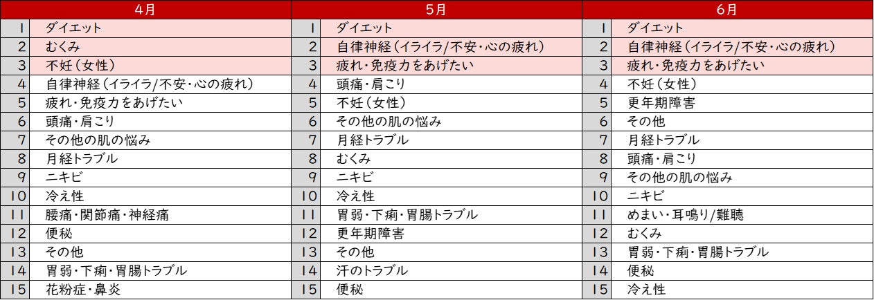 4位以下には、病院にいくほどでもないし…と辛さを我慢してしまいがちなお悩みが続きます。これらのお悩みは放置しておくと身体の準備ができないまま新しい季節を迎えてしまい、身体に大きな負担を与えることも。「いつものことだから」と見過ごさず、身体からのサインをしっかり受け取って自分自身の体質を見直すきっかけにしていただければと思います。