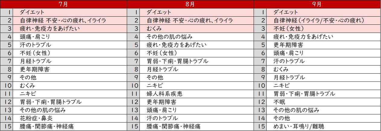 8月には3位に「むくみ」がランクイン。今年の夏の記録的な猛暑と長雨の影響を大きく受けていると考えられます。湿度が増えると、汗を十分にかくことができないなど、身体の水の巡りが悪くなり「むくみ」などの不調につながりやすい季節でした。
