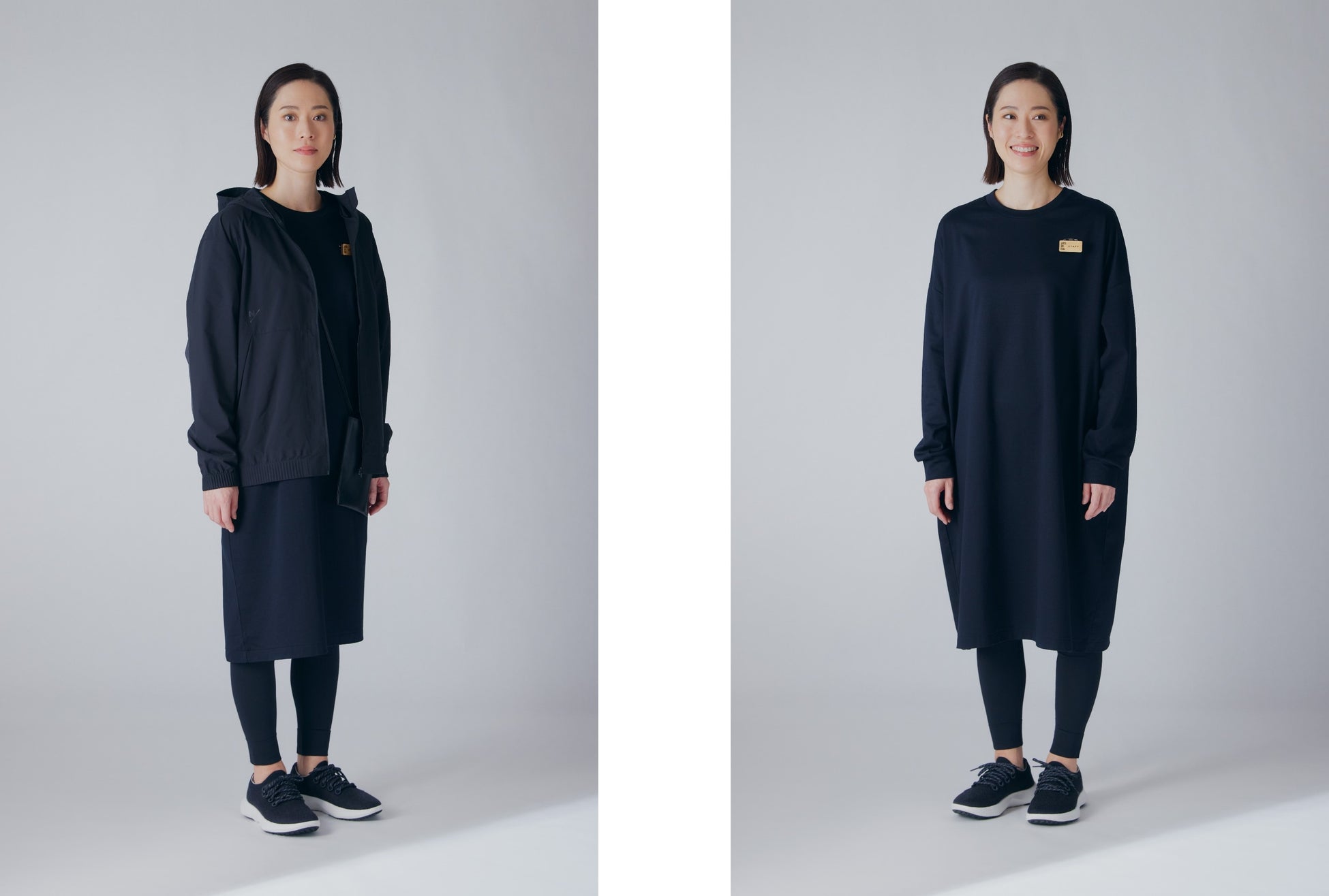 春夏はワンピースにレギンス、秋冬はフード付きのジャケットを重ねます。足元はスニーカー。アクティブライフを応援するブランドコンセプトを反映して、動きやすい機能性も重視し、すべて環境配慮型素材を用いたものを採用しました。