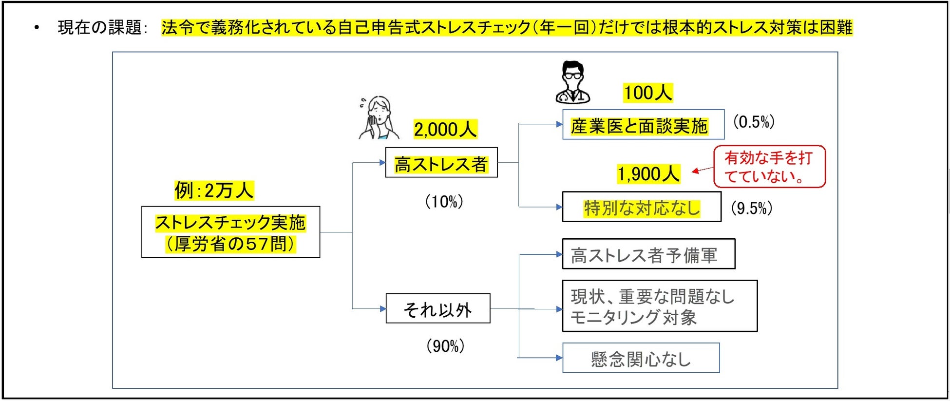 これでは、自覚していない心の状態(精神状態や脳の疲労度など)を示すことは困難です。よって現在のストレスチェックでは、高ストレス者本人やその人の所属する組織が、高ストレス状態の改善に努める機会を逸するリスクがあります。