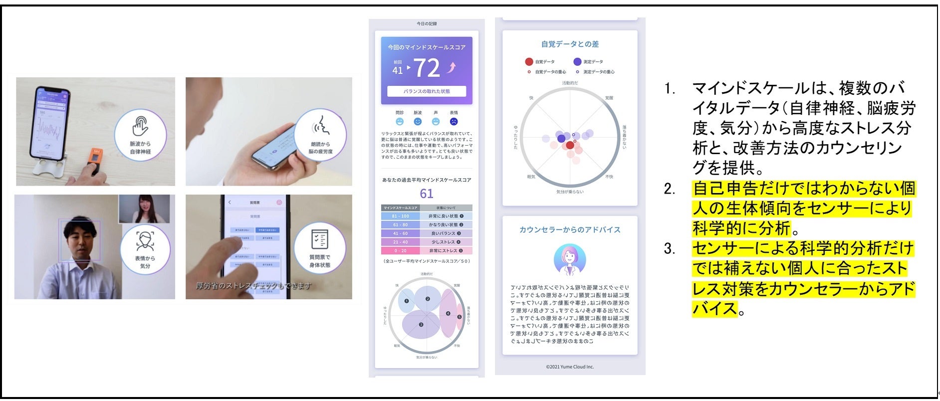マインドスケールは、こうした高ストレス状態の改善に努める機会を逃すリスクを減らすために、極めて精度の高いシステムにより計測した複数のバイタルデータを、心理学と脳科学の知見を基に分析する「感情表現エンジン※」を用いた技術です。