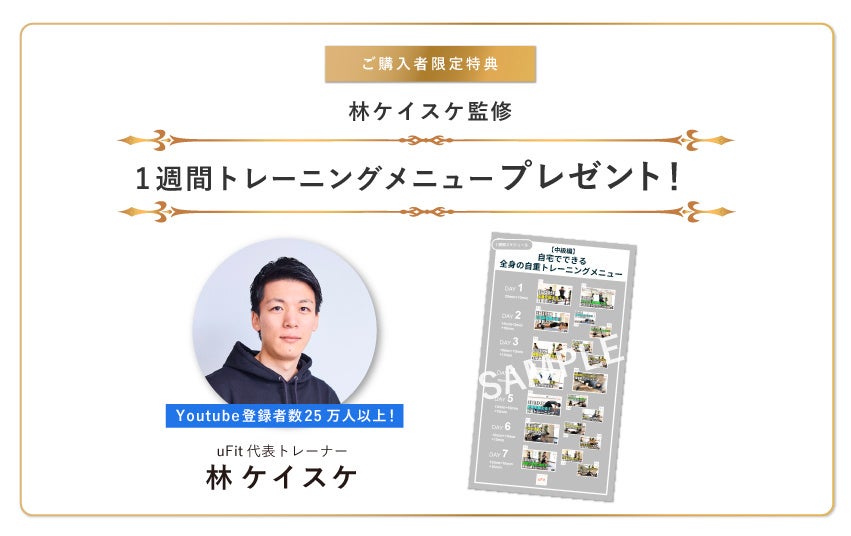 登録者数25万人のトレーニング系YouTuberで、uFit代表の林ケイスケが監修する、1週間のトレーニングメニューを見ることができます。