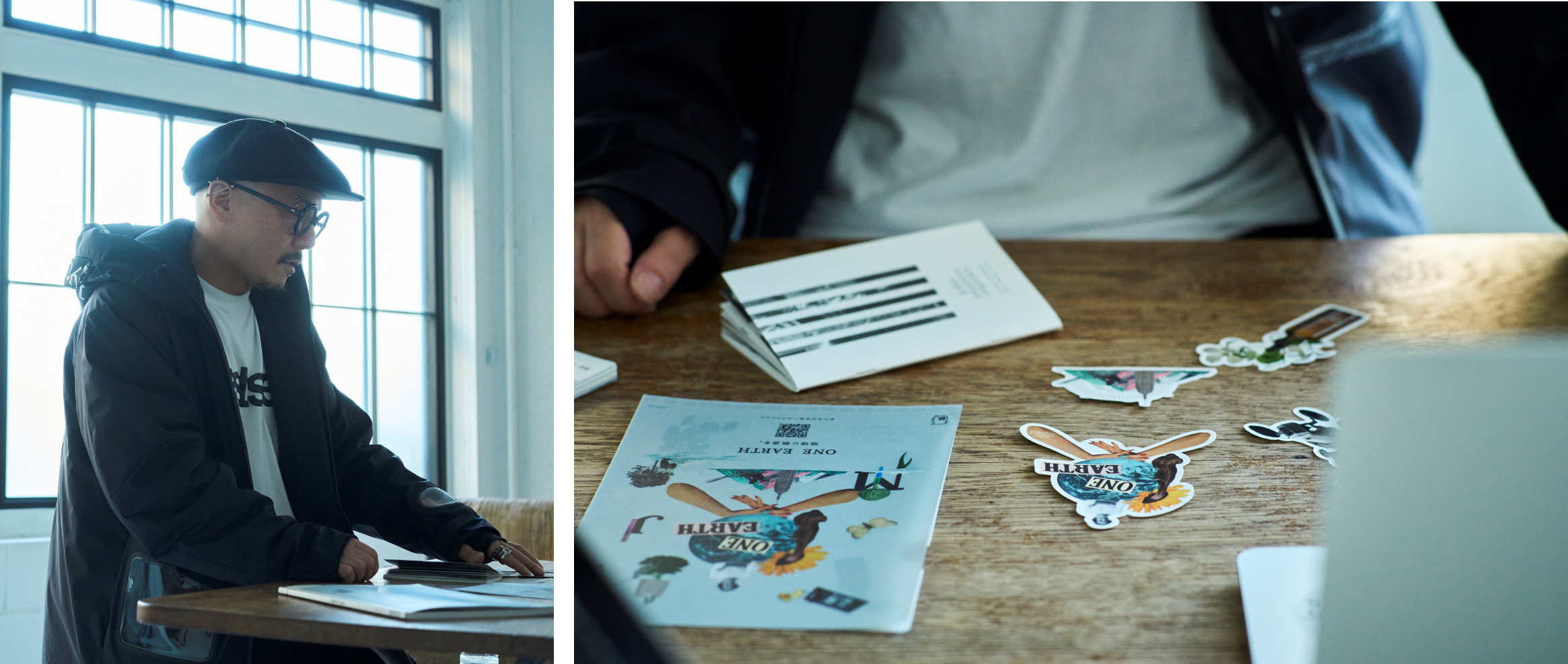 一見不思議な世界観のコラージュアート。しかし、そのイラストひとつひとつに込めた意味やメッセージ、ブランドの姿勢や想いをどのように表現したのか等、コラージュアーティスト・Q-TA本人が語ります。また、スローガン『地球に敬意を。-ONE EARTH-』から感じた新たな世界と彼が描くストーリーとは。