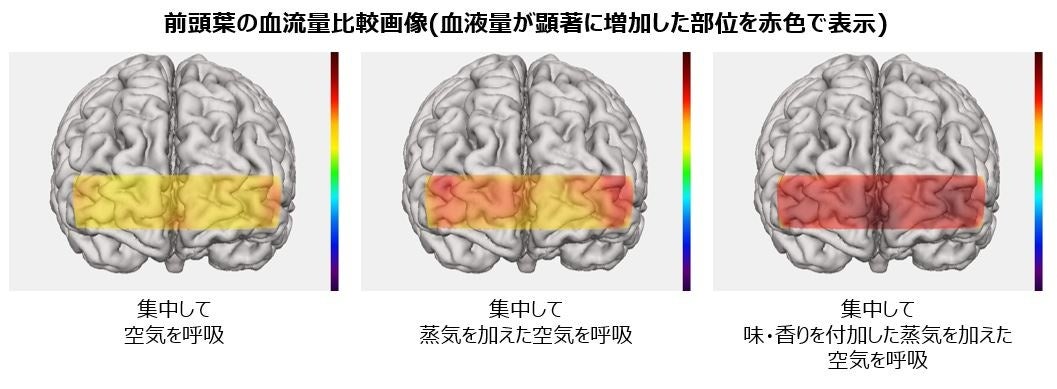 呼吸には自律神経のバランスを整える作用があることが知られていますが、今回の試験によって、蒸気に味・香りを付加することにより呼吸への集中度が増すと、空気や空気に蒸気のみを加えた場合より前頭葉の血流量が増加し、前頭葉の働きが活性化することが確認できました。