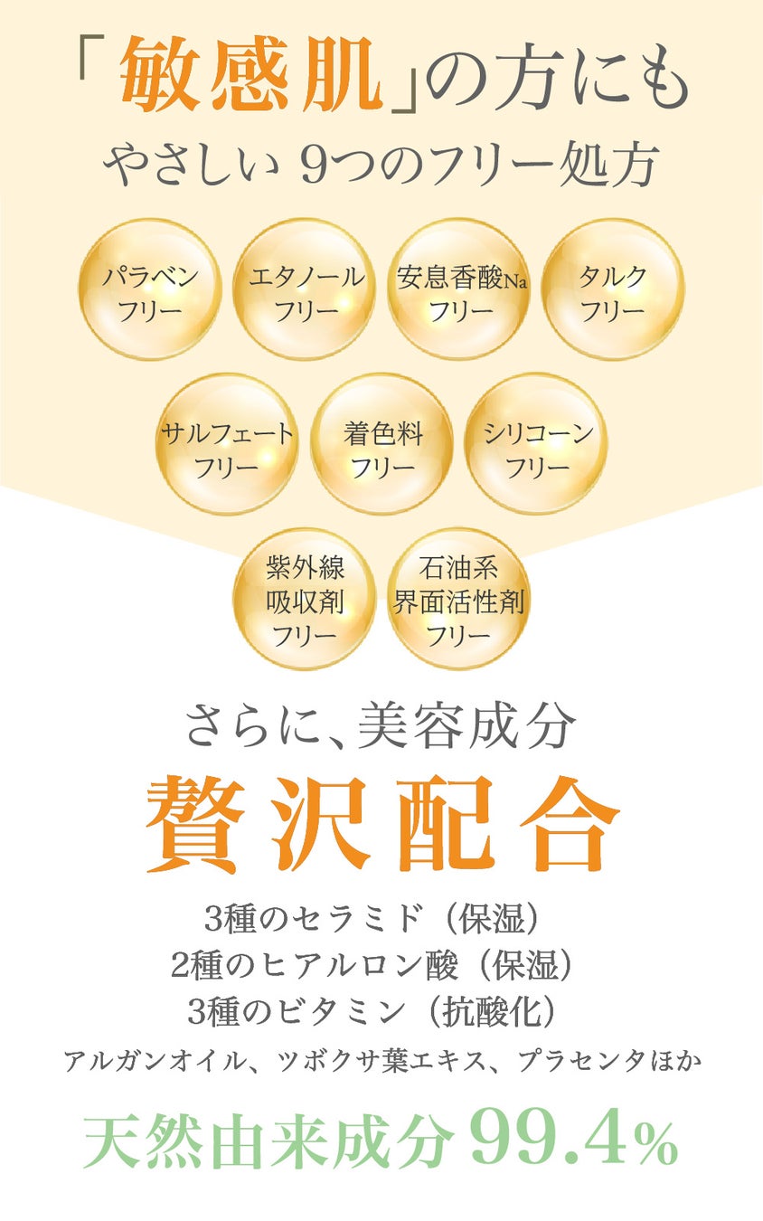 パラベンフリー・エタノールフリー・安息香酸Naフリー・タルクフリー・サルフェートフリー・着色料フリー・シリコーンフリー・紫外線吸収剤フリー・石油系界面活性剤フリー。