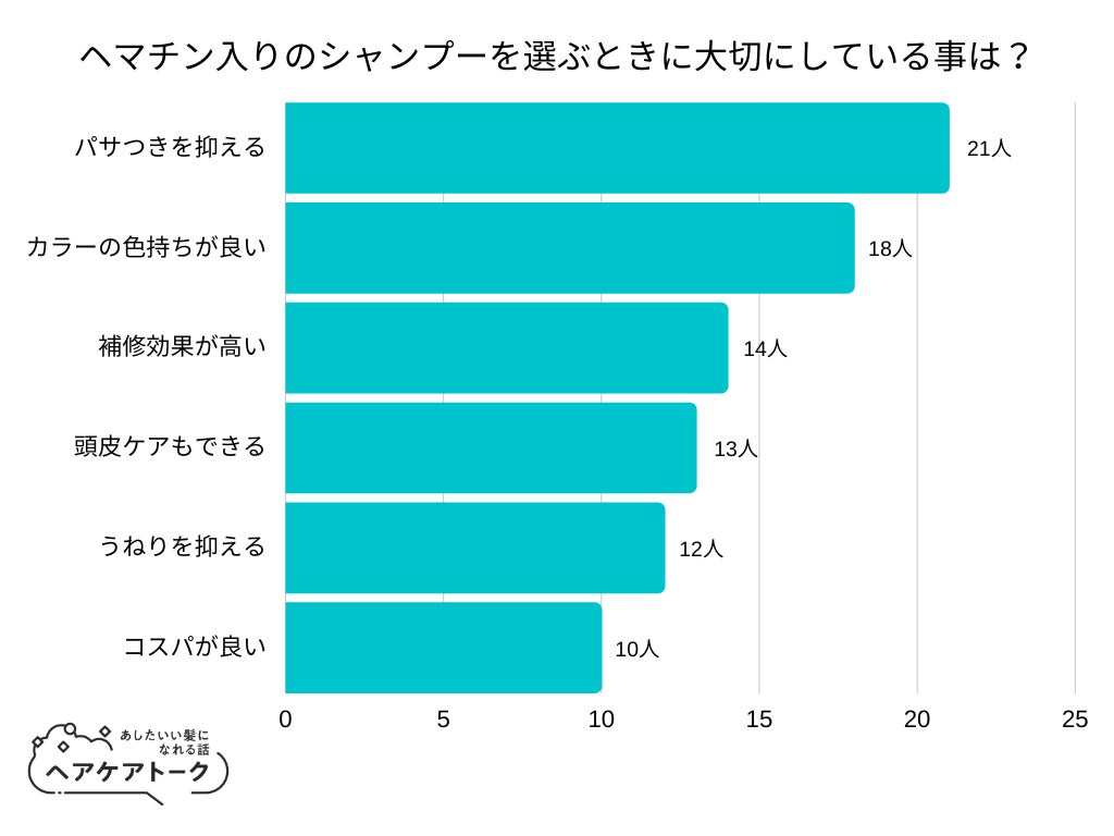 「ヘマチン入りのシャンプーを選ぶときに大切にしている事は?」とアンケート調査した結果、1位は『パサつきを抑える』でした。