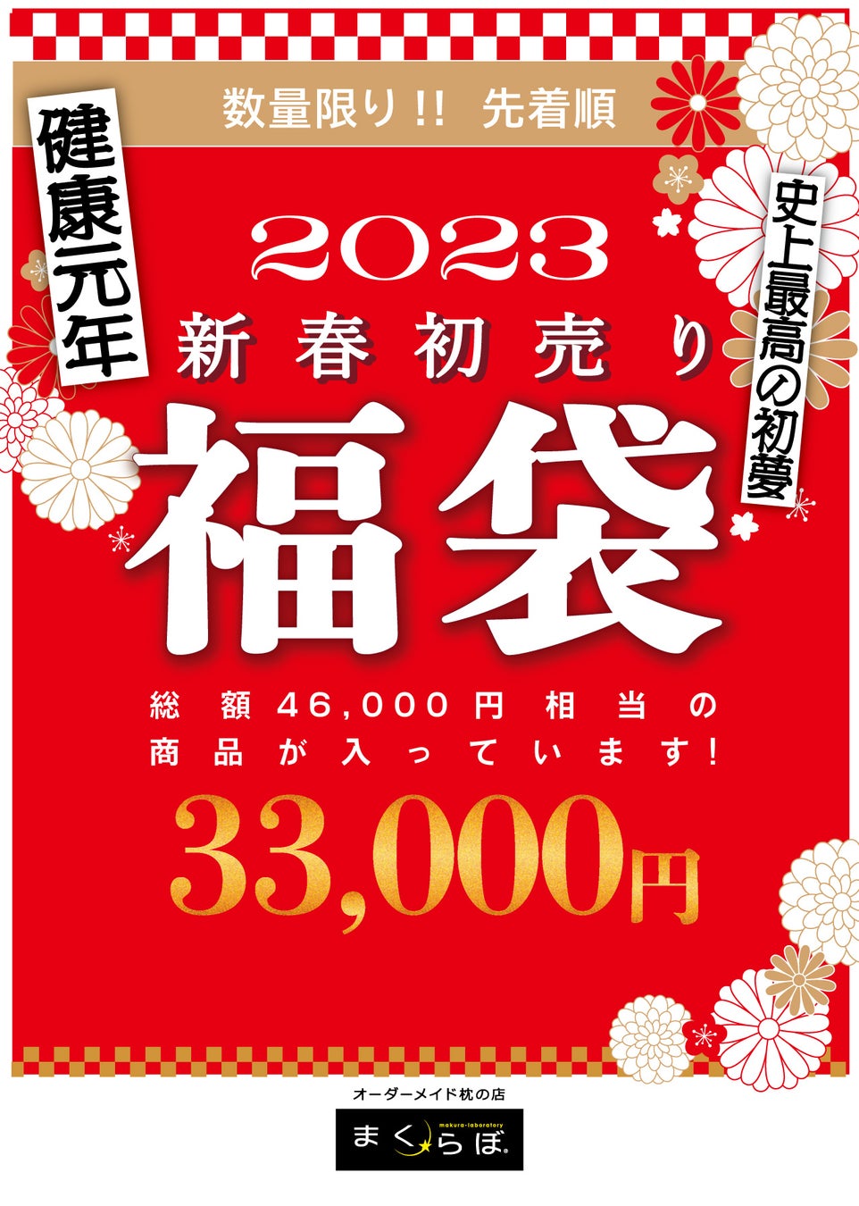 オーダーメイド枕の店「まくらぼ」を運営するFutonto株式会社(本社:東京都町田市 代表取締役社長:齊藤 淨一 以下、まくらぼ)は、全国各まくらぼ店舗にて新春初売りの「2023年まくらぼ福枕」を販売いたします。自分だけの枕をお得にお買い求めいただけるこの機会を是非ご活用ください。数量限定ですので、どうぞお見逃しなく!