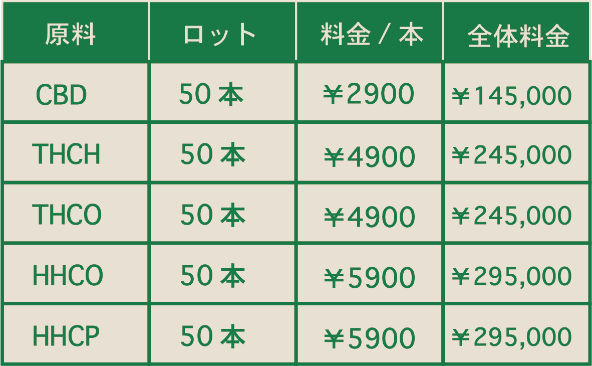 - THCH/HHCP/THCO/HHCOなどの製造も可能
