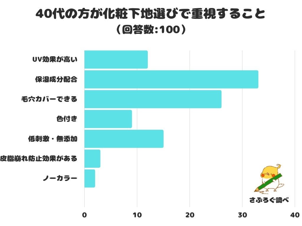 40代の方が化粧下地選びで重視することをアンケートにて調査したところ、1位は「保湿成分配合」でした。